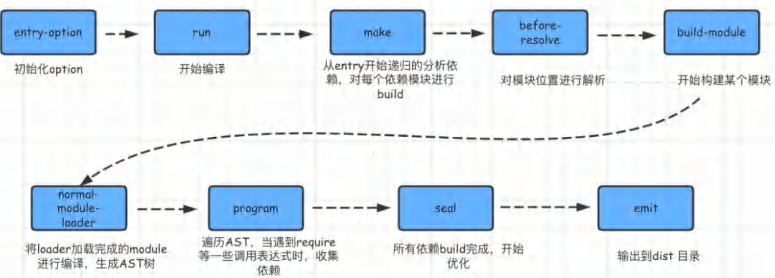 输出流程:对编译后的 Module 组合成 chunk ,把 chunk 转化为文件,输出到文件系统中