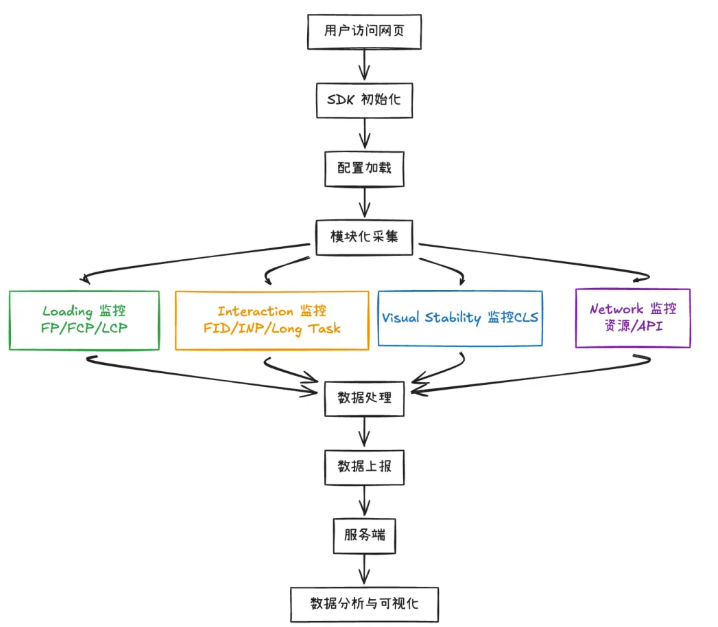 性能采集:通过浏览器原生API采集加载、交互、资源等指标,结合自定义埋点采集业务性能指标;
