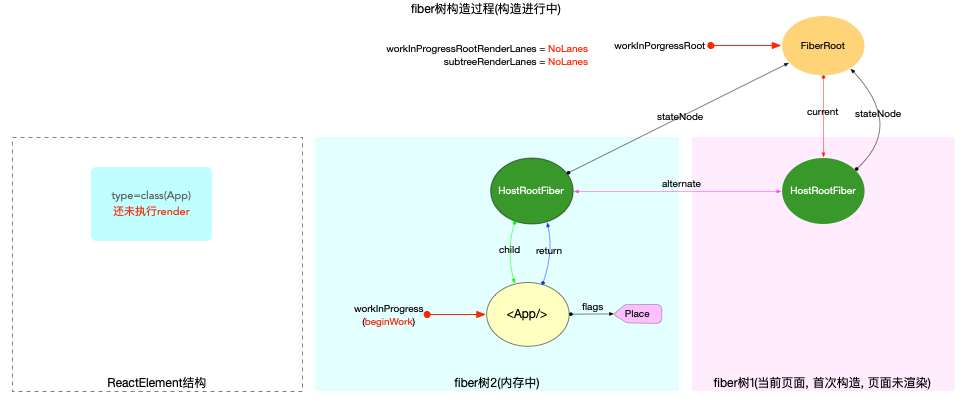 workInProgress指针指向fiber(<App/>)节点, 此时current = null执行过程: 调用